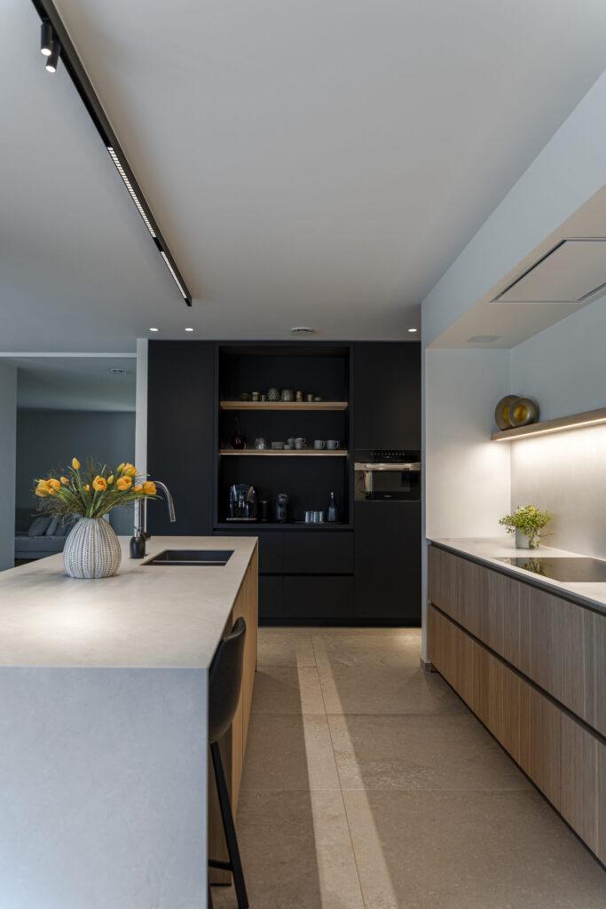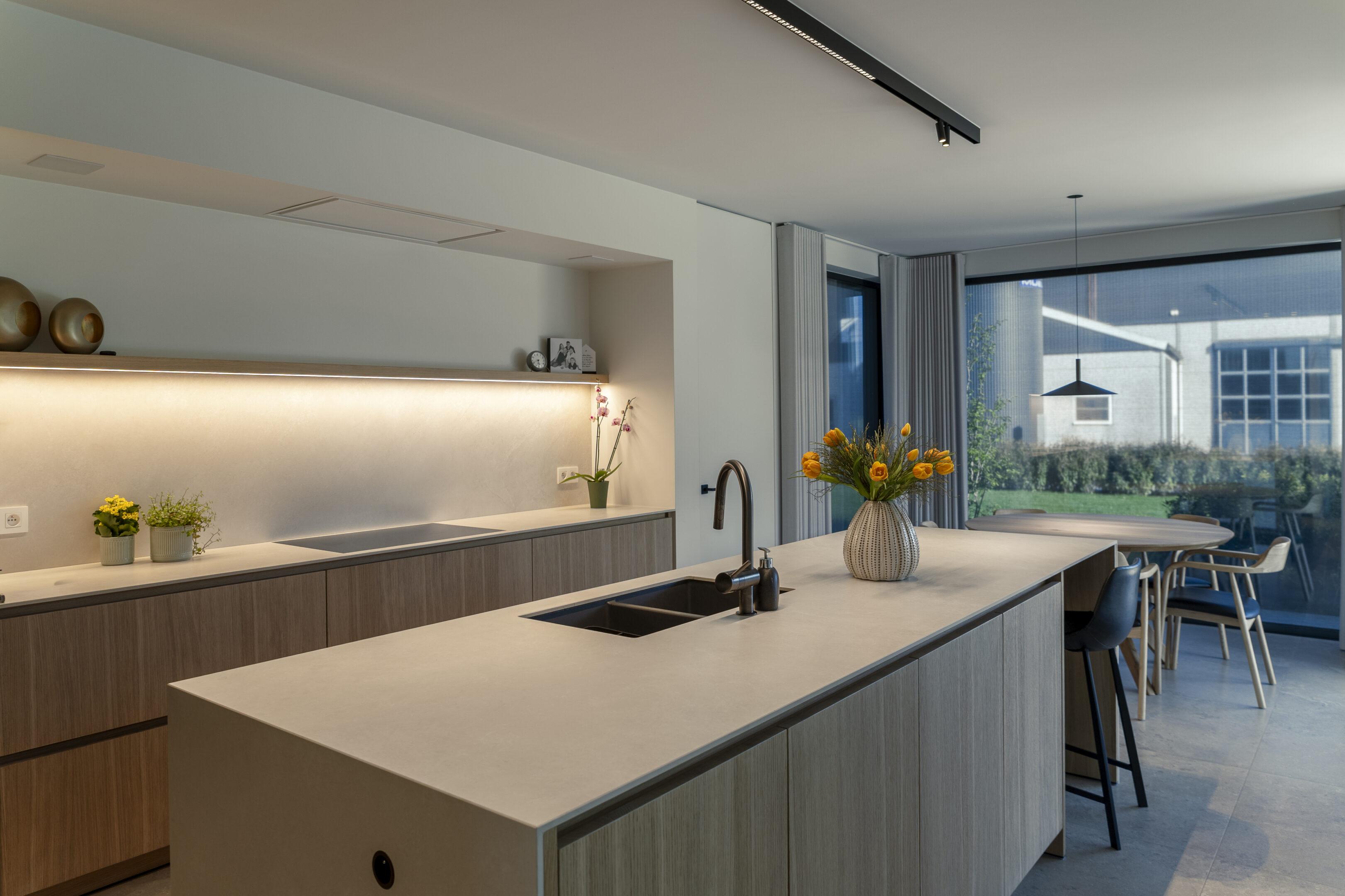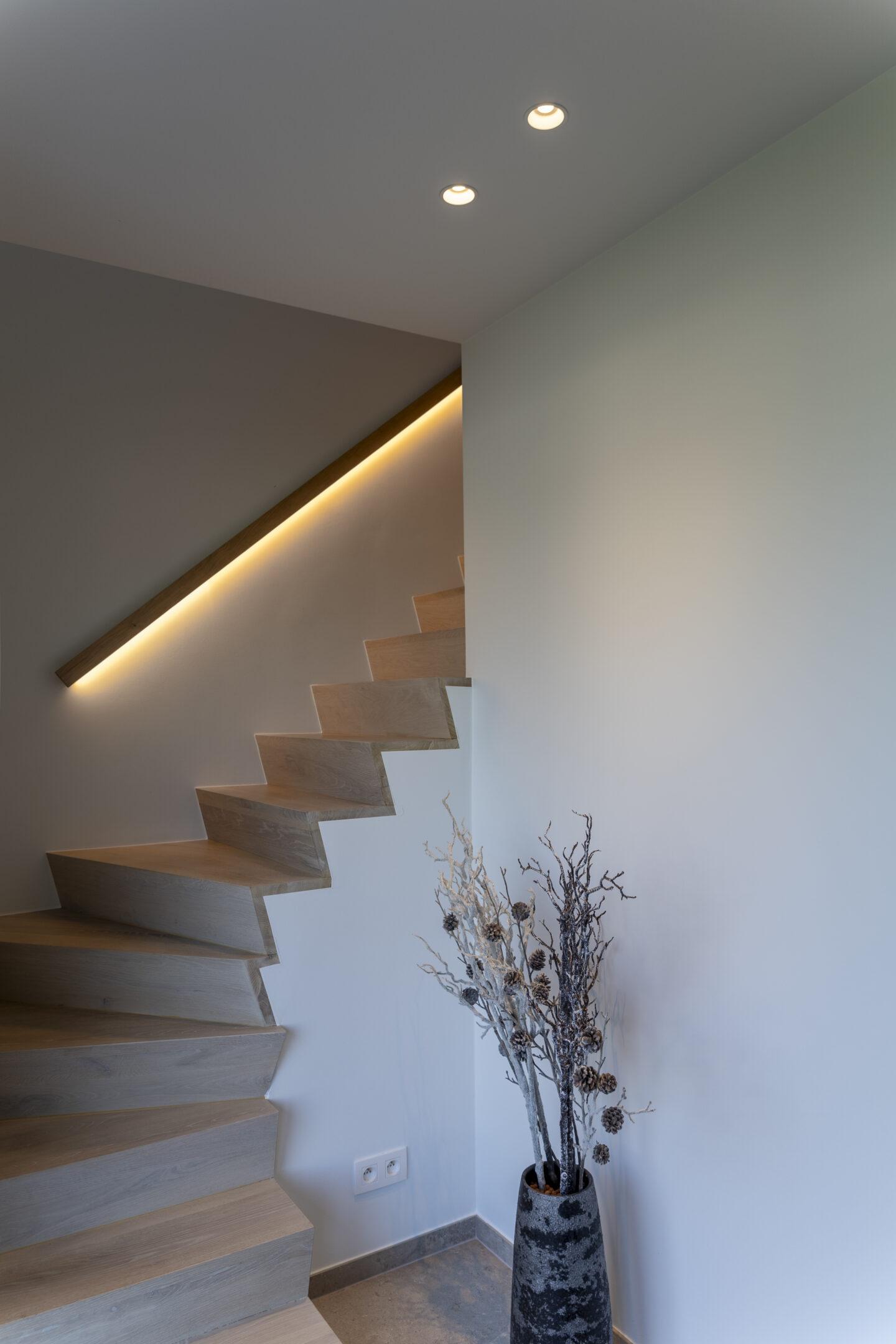 Doorheen het huis werden sfeervolle pendels boven de eetkamertafel, een strak tracksysteem in de keuken, indirecte ledverlichting in kasten en trapleuning, en zorgvuldig gepositioneerde spots gecombineerd die elke ruimte net het juiste karakter geven. Zwarte accenten, warm eikenhout en lichte natuursteenkleurige materialen werden bewust versterkt door de lichtkleur en lichtrichting.