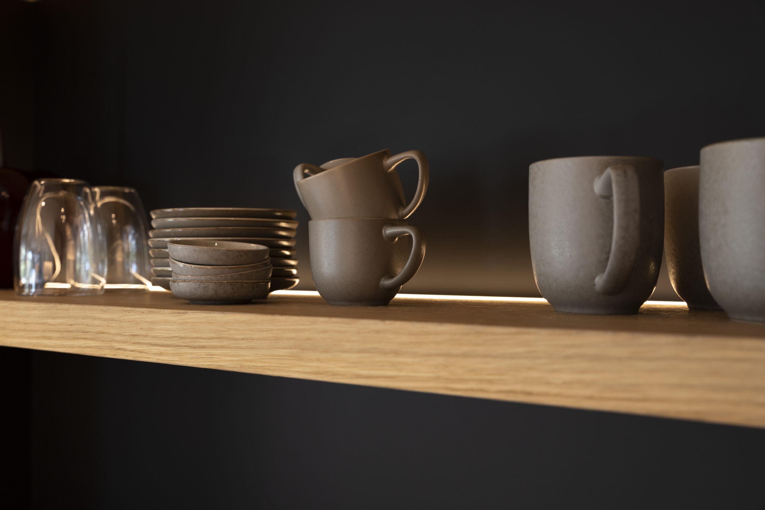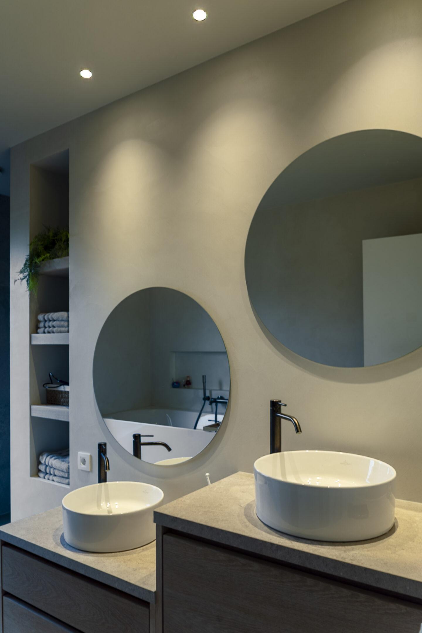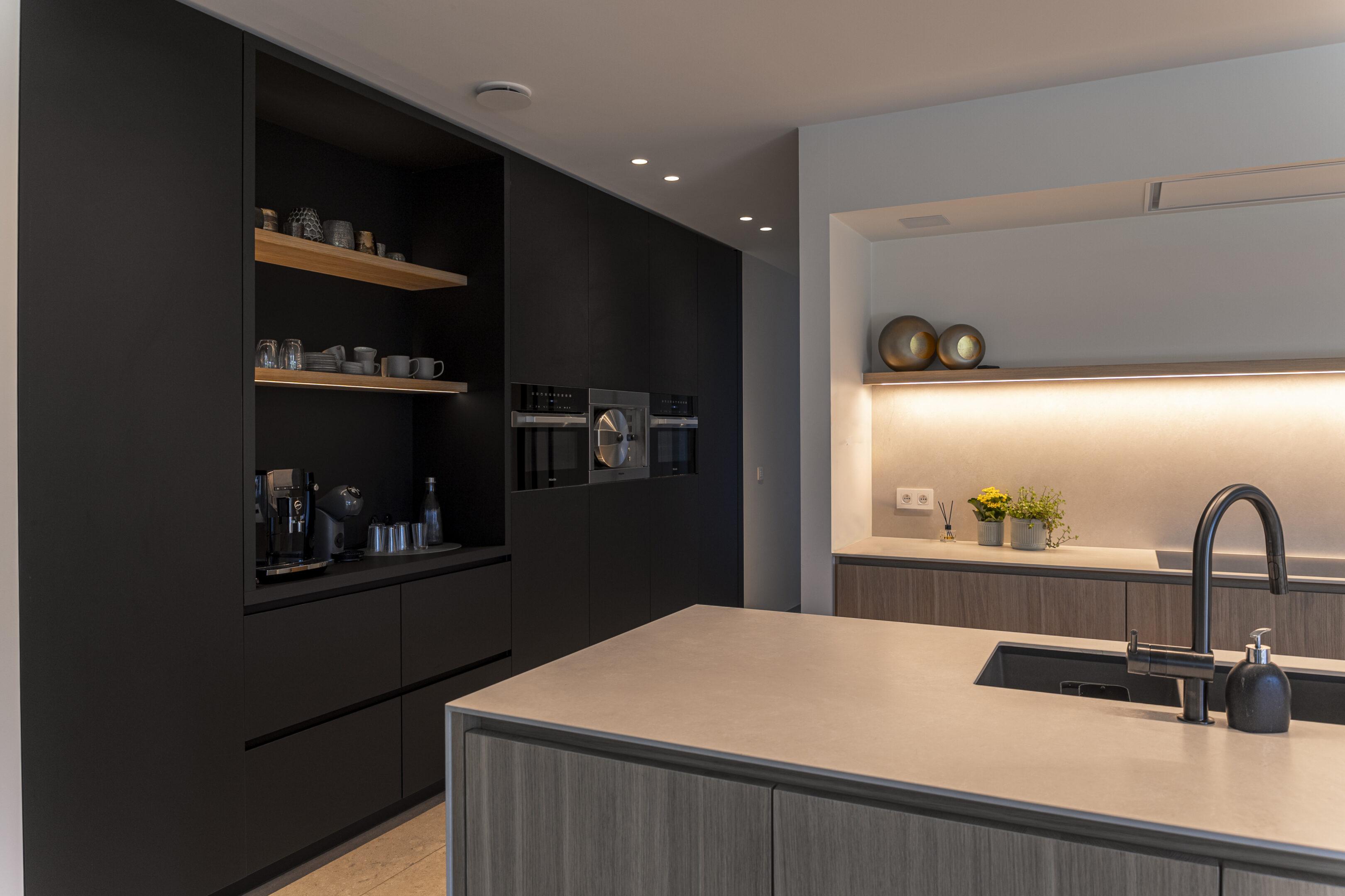 Doorheen het huis werden sfeervolle pendels boven de eetkamertafel, een strak tracksysteem in de keuken, indirecte ledverlichting in kasten en trapleuning, en zorgvuldig gepositioneerde spots gecombineerd die elke ruimte net het juiste karakter geven. Zwarte accenten, warm eikenhout en lichte natuursteenkleurige materialen werden bewust versterkt door de lichtkleur en lichtrichting.